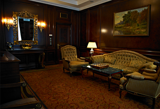 Presidential suite ( 1 room ) : 5-room 2-bed room consists of a bedroom with a double bed , bedside tables, office with a library , fireplace room with sofas, TV, air conditioning , dining room ( can be used as a meeting room ) and guest bedroom with double bed. There are 3 bathrooms ( sauna, jacuzzi , toilet , bidet ) . There is a dressing room for security and a small kitchen . Connection to the royal apartments . Maximum number of people in a room is 6. Room size 171 sq.m.