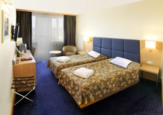 Standard - (22 sq m) with beautiful views to the city are situated on the 2-7 floors of the hotel. Standard room consists of an entrance hall, bathroom,Individual climate control system, Complimentary high-speed Wi Fi and internet access, In-room safety-deposit box,LCD TV sets with satellite television and interactive TV,Mini bar, International telephone calls, Hairdryer, Robe and slippers, Electronic room key, Balcony (some of rooms). Quantity of Standard rooms at President Hotel: 300.