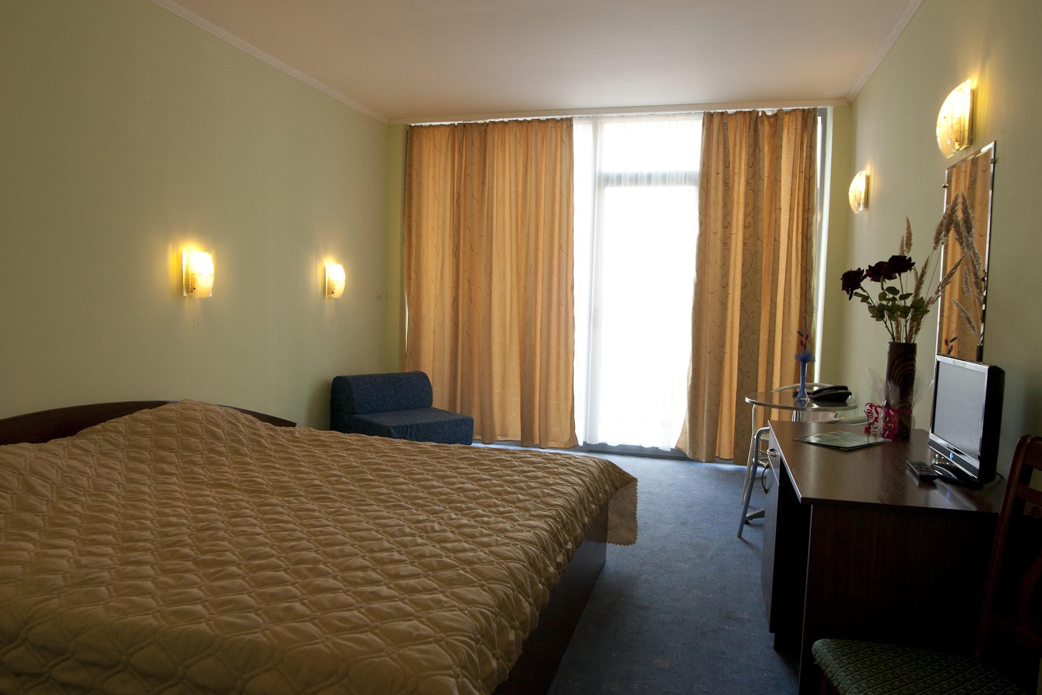 Трехместный номер имеет 3 стандартные кровати с возможностью дополнительной кровати.