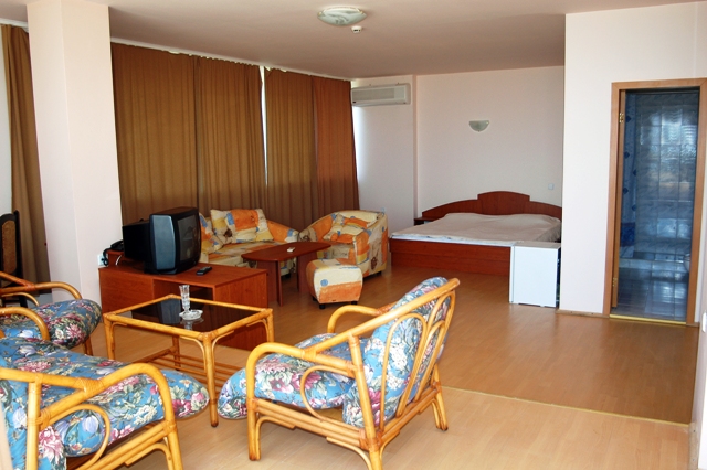 - Кондиционер, спутниковое ТВ, телефон, мини-бар ($), санузел с душем;