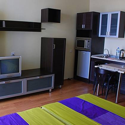 В номерах: Интернет, телевизор, телефон, ванной комнатой, каждый номер имеет свою кухню с посудой и микроволновой печью.
