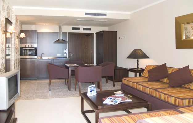 - Ap1Bedroom (58 кв.м.) – вид на море/вид на парк/ вид на бассейн, спальня, гостиная (межкомнатная дверь), двуспальная кровать/две отдельные кровати, доп. место - диван-кровать, кухонный бокс, холодильник, ванна, гладильная доска, утюг, пол – ковролин.