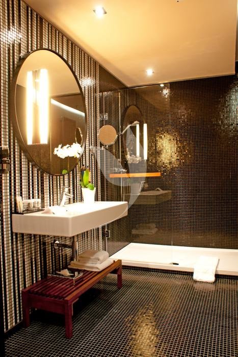 Стильная современная ванная комната с просторной душевой кабиной и туалетом