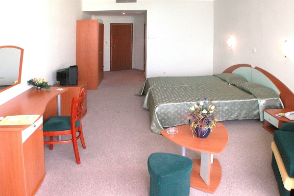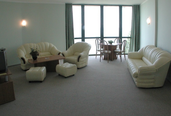 - Ap2pax (35 кв.м.) – спальня, гостиная (межкомнатная дверь), двуспальная кровать/две отдельные кровати, доп. место - диван-кровать, кондиционер, спутниковое ТВ, телефон, кухонный бокс, мини-бар ($), холодильник, балкон, ванна, фен, косметический набор в ванной, сушилка для белья, пол – ковролин
