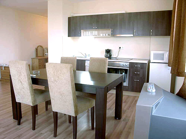 - Studio (24 кв.м.) – две отдельные кровати, кондиционер, спутниковое ТВ, телефон, кухонный бокс, мини-холодильник, сейф ($), балкон, ванна, фен, косметический набор в ванной, сушилка для белья, пол – ковролин, паркет.