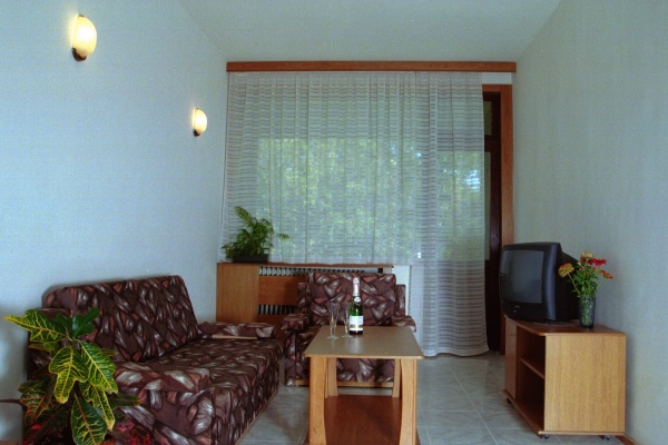 - Апартаменты с 1-й спальней (45 кв.м, гостиная с мягкой мебелью и 1 спальня, разделенные дверью). Вид на парковую сторону