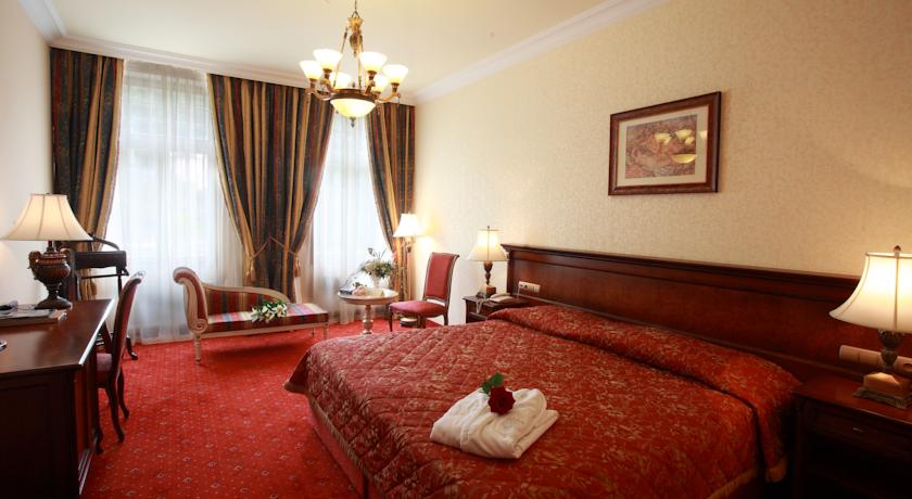 Каждый номер оснащён ванной комнатой, мини баром, TV с русскими программами (РТР – Планета, НТВ, Первый ОРТ, CASPIO NET, Вести, Спорт – Планета, INTER+, RU TV). Интернетом, сейфом, феном для волос. Портьеры, занавески, обивка мебели в гостевых комнатах – точные копии коллекций, изготовлены теми же испанскими мастерами, что трудились в президентском дворце в Праге. Мебель в номерах, выходящих на двор, произвели мастера знаменитой на весь мир итальянской фирмы «SCAPINI». В номерах с видом на Колоннаду авторскую мебель из красного дерева выполнили чешские ремесленники. Для спокойного и комфортного сна мы постелили анатомические матрасы с независимыми пружинами. Это позволит нашим гостям полноценно отдыхать во время сна. Бельё для постелей, полотенца, халаты произведены из высококачественного хлопка ведущей чешской фирмой «TIBEX». Пледы изготовлены из натуральной австралийской овечьей шерсти. Для сохранности ценных вещей, в платяных шкафах мы установили сейфы повышенного качества, работающие от Вашей личной кредитной карточки.Возможность дополнительной кровати в номерах LUX и APT,также имеется номер для инвалидов-SINGL. Все комнаты категории Standart выходят на тихий двор. Вы оцените тишину и спокойствие, отдыхая на балконе. Если Вы находитесь на лечении с маленькими детьми, то номера Standart с выходом на террасу – идеальный вариант. Дети могут покататься с горки, наверняка, обживут «домик» со столиком и стульчиками. Для совсем малышей в отеле имеются детские кроватки, горшочки, подставки для умывания, игрушки, велосипеды, колясочки для детей и их кукол. Для семей с детьми или пары с друзьями мы рады предложить номера системы «интер-коннект», которые соединены между собой общей дверью. Косметические наборы, швейные принадлежности, средства ухода за обувью, халат, тапочки приготовлены для каждого гостя. Если Вам необходим халат, большего размера или нужны санитарные принадлежности для женщин, бритвенные наборы для мужчин и некоторые другие средства, просим Вас без стеснения обращаться на стойку рецепции.