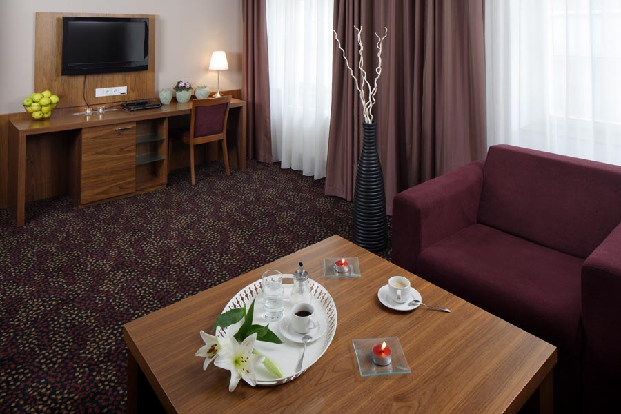 Оборудование номеров: Ванная комната с душевой и феном (стандартные номера); Ванная комната с ванной и феном (апартаменты); Мини-бар; Телефон с прямой линией; Сейф; Кондиционep; Спутниковое телевидение s DvD; Wifi и бесплатный кабельный интернет; Детектор дыма и oгня; Oборудование для прготовления чая и кофе; Гостиная (в апартаментах)