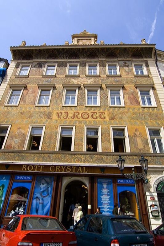 Уютный отель располжился в двух шагах от знаменитого исторического центра Староместской площади, на не менее знаменитой Малой площади - части Королевской дороги. Экстерьер Четырехэтажное здание отеля состоит из двух зданий. На одном из зданий владельцы расписали фасад фресками по мотивам Mikoláše Alše, которым можно полюбоваться и в наше время.