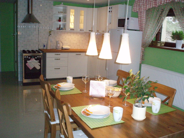 Коттедж для 11 человек Структура комнат в коттедже: Первый этаж: кухня (газовая плита с печкой, холодильник с морозильной камерой, посуда, большой стол, стулья) с гостинной (диван, телевизор, камин). Большой санузел – туалет, душ. Второй этаж: две спальни, одна из них двухместная и одна трёхместная, одна ванная комната с душом. Третий этаж: спальня с двумя кроватями, диван. В вилле два балкона.