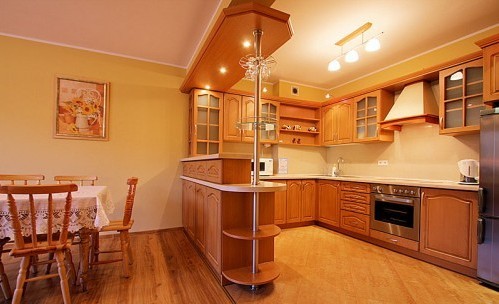 5-ти местные апартаменты состоят из из гостиной с кухонным уголком и ОДНОЙ (проходной или смежной) спальной комнаты. Спальные места в таком апартаменте представлены двуспальной кроватью в выделенной спальной комнате, раскладным одно- и двухместным диваном в гостиной. В апартаменте нет выделенной в отдельное помещение кухни.