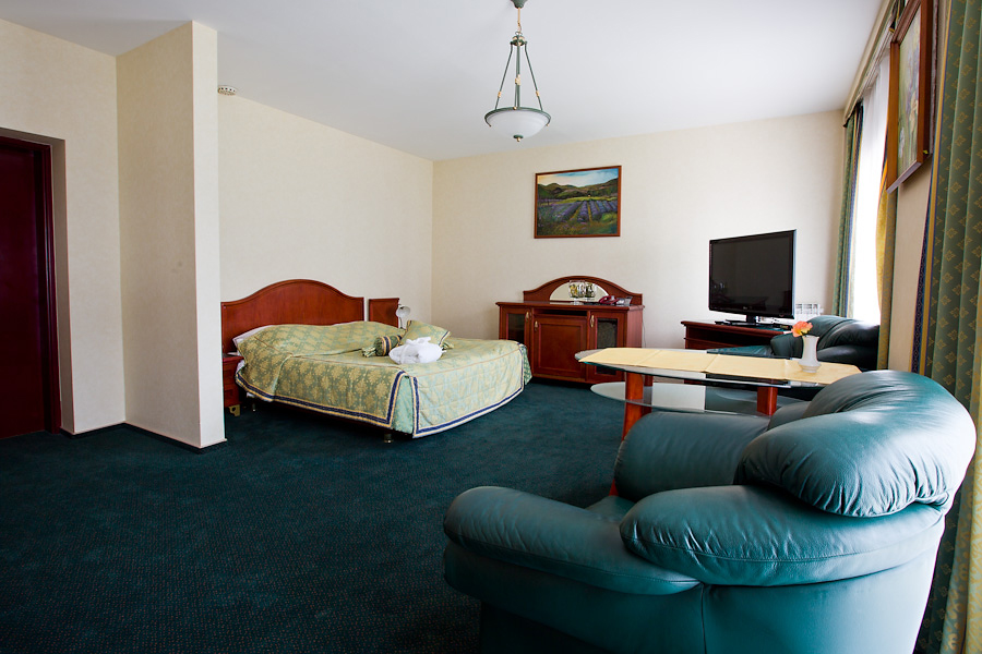 В расположениии Гостей 170 мест. Предлагаются апартаменты, а также комфортабельные номера оборудованные мини-баром, телевизором, телефоном, доступом к Интернету и холодильником.