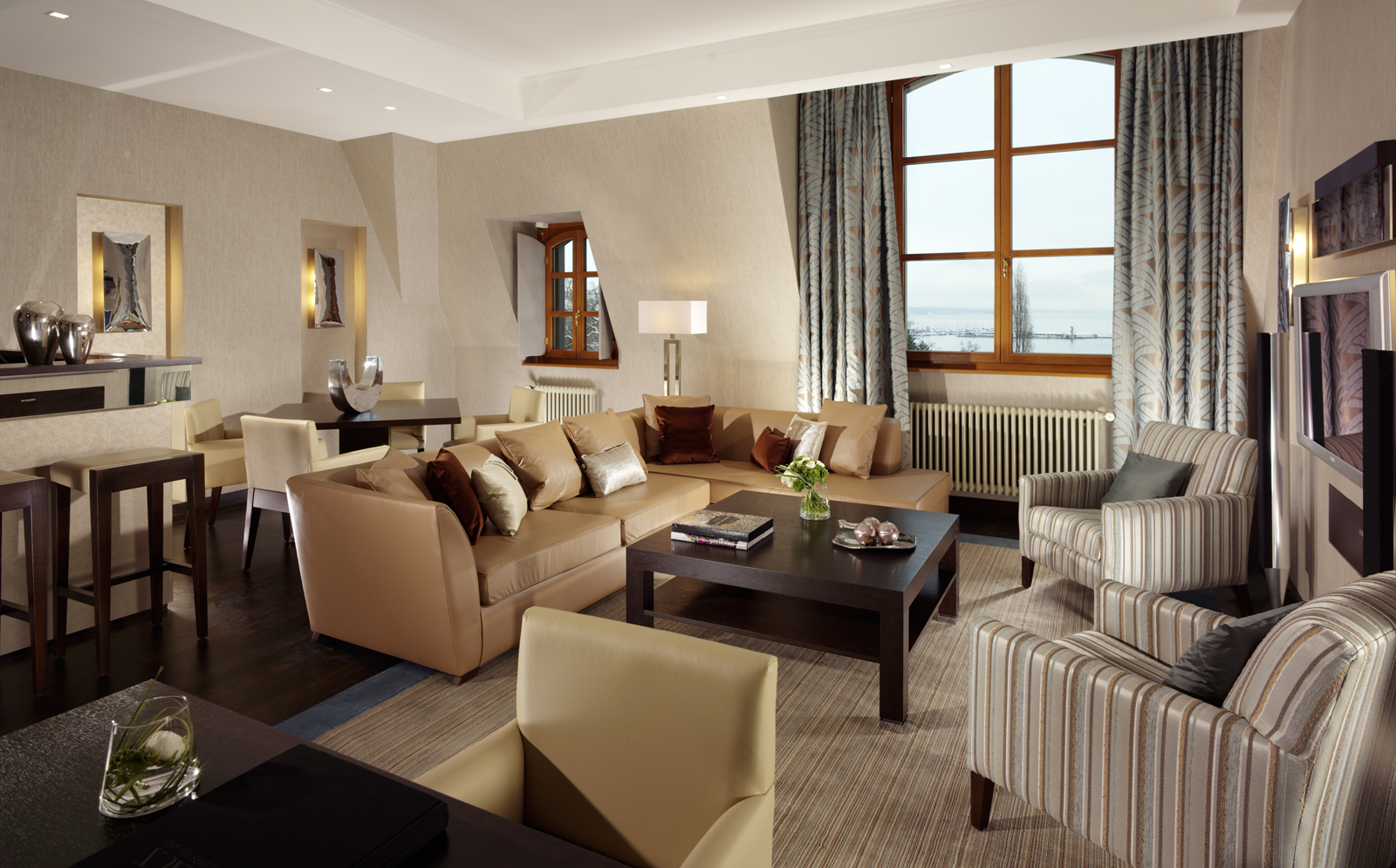 Leman Suite: 80 м2, расположен на 4 этаже с видом на озеро, сад и Jet d'Eau. Состоит из спальни с кроватью king-size, гостиной с рабочей и обеденной зоной, ванной комнаты с джакузи и тропическим душем. Возможно соединение с Advantage Lakeside Room.