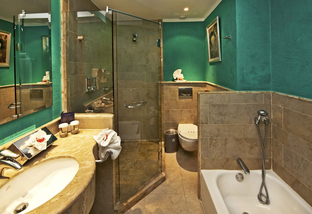 Диванная и спальная зоны на разных уровнях; ванная комната с феном, кондиционер, вентилятор, телевизор, мини-бар с прохладительными напитками, телефон, сейф ($);