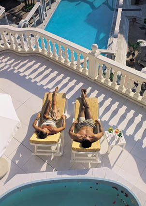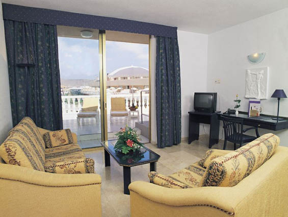 - Julio Cesar Palace является частью комплекса из пяти отелей Mare Nostrum Resort, который находится на юге Тенерифе непосредственно на берегу океана. В четырехэтажном здании этого комфортабельного пятизвездочного отеля разместились 116 номеров различных типов. Вместе с аналогичными по уровню комфорта и сервиса и почти одинаковыми внешне отелями Cleopatra Palace и Marco Antonio Palace, Julio Cesar Palace образует своеобразную букву «П», внутри которой расположен подогреваемый «римский» бассейн с прохладным фонтаном, окруженный мраморными колоннами и статуями, а также джакузи. Бассейн обслуживается официантами. Лежаки, зонтики и полотенца отдыхающим предоставляются бесплатно. Julio Cesar Palace построен перпендикулярно береговой линии, поэтому половина номеров смотрит на внутренний бассейн, а другая – на небольшой парк. Исключение – два самых престижных номера, имеющие вид на океан. Однотипные номера всех трех отелей отличаются только оформлением интерьеров. В отеле предусмотрены следующие типы номеров: 47 стандартных двухместных номеров с балконом и видом на бассейн; 46 стандартных двухместных номеров с видом на парк; 5 сьютов с балконом и видом на бассейн; 7 люксов с террасой, собственным бассейном и видом на бассейн; 9 люксов с террасой, собственным бассейном и видом на парк; 2 сьюта-люкса с террасой, собственным бассейном и видом на океан.