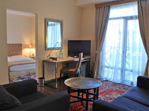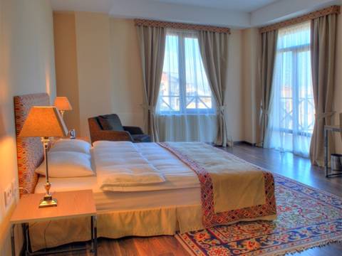 - В номерах: кондиционер, центральное отопление, телефон, интернет, минибар, DVD плеер, фен, телевизор, сан- узел, джакузи.