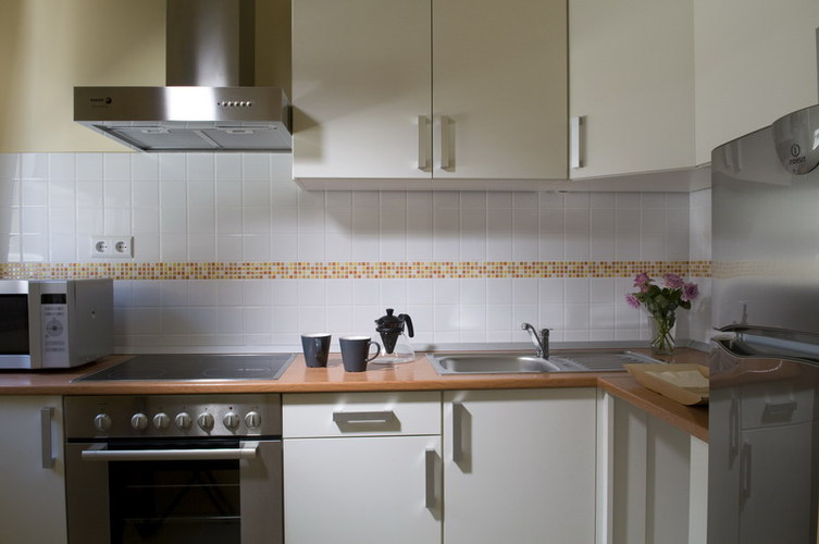 полностью оборудованная кухня с газовой плитой, кофеваркой, чайником, тостером, посудой, столовыми приборами и кухонными принадлежностями