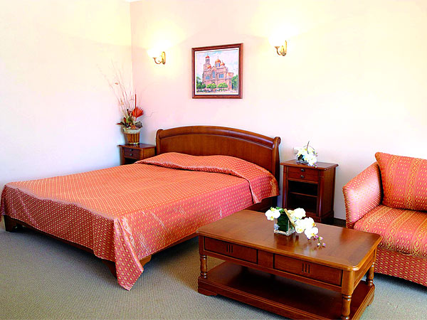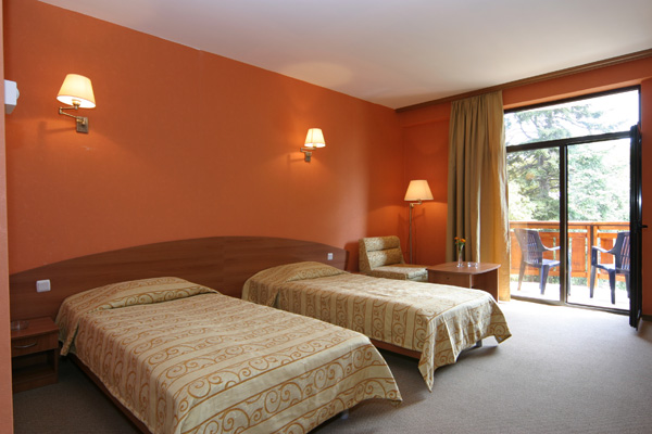 - Двухместный номер (22 кв.м.): двуспальная кровать, две отдельные кровати, телефон, TV SAT, кондиционер, балкон, фен, сушилка для белья, пол в номере – ковролин.