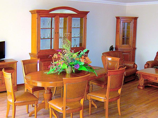 - Апартамент с 1 спальней (32 кв.м.): двуспальная кровать, диван-кровать, кондиционер, душ, ванна, фен, TV SAT, телефон, балкон, мини-бар, сушилка для белья, кухонный блок, посуда и столовые приборы, вытяжка, холодильник, пол в номере – ковролин.