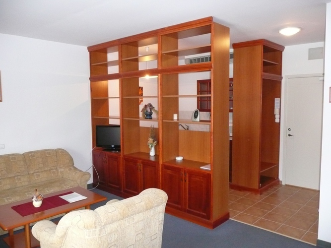 - Апартаменты отеля, площадью 54 кв.м., рассчитаны на проживание максимум 4-х человек. Ванная отделена от гостиной занавеской. В спальне находится одна двуспальная кровать, в гостиной диван, раскладные кресла. В апартаментах есть кондиционер, телевизор, телефон, радио с будильником, мини-бар, чайная кухня с микроволновой печью.