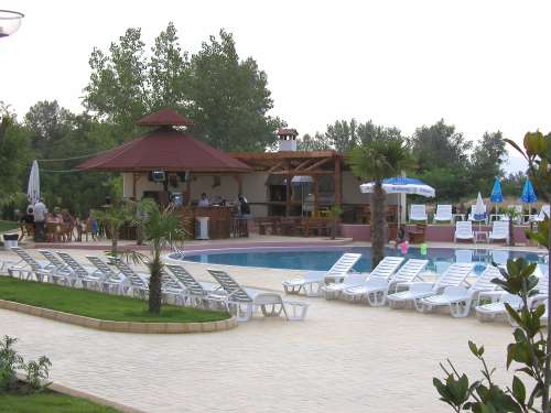 - Открытый бассейн, зонтики и лежаки у бассейна;