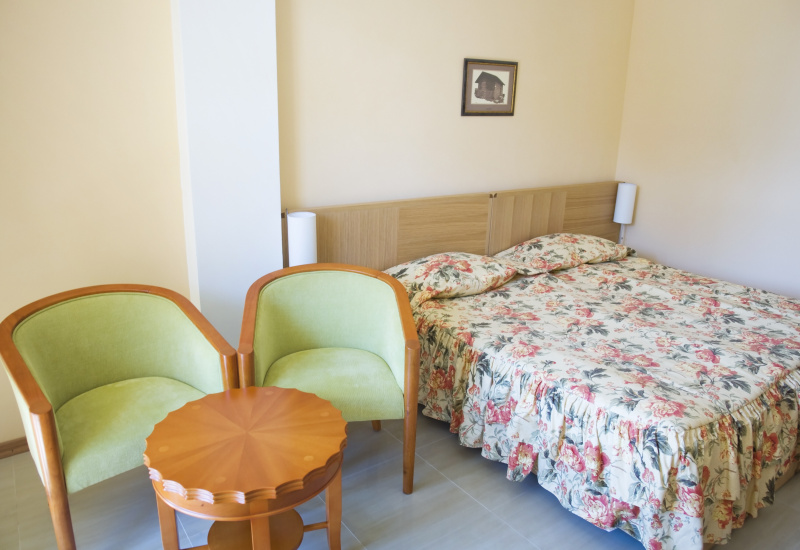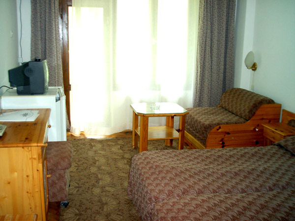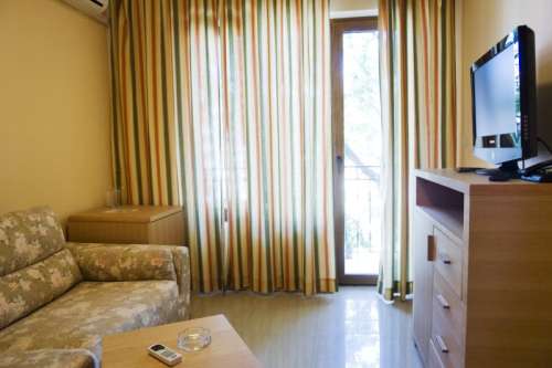 - Junior Suite (23 кв.м.) – двуспальная кровать/две отдельные кровати, доп. место - диван-кровать, кондиционер, TV SAT, телефон, электрочайник (под запрос), мини-бар ($), доступ в интернет ($), ванна, фен, косметический набор в ванной, сушилка для белья, утюг, пол – плитка.