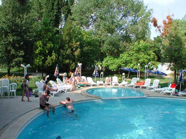 - Открытый бассейн, зонтики и лежаки у бассейна;