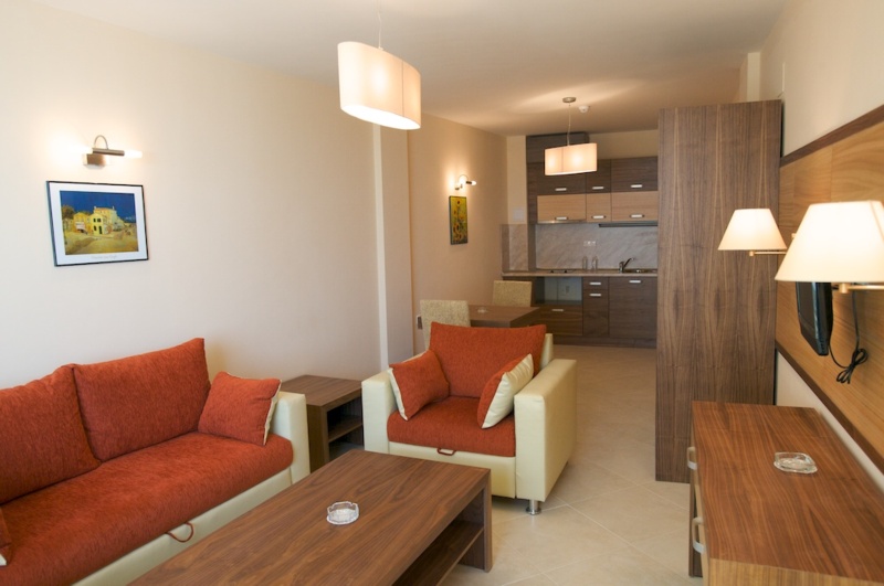 - Ap1Bedroom (60 кв.м.) – спальня, гостиная (межкомнатная дверь), две отдельные кровати, доп. место - диван-кровать, кондиционер, TV SAT, телефон, оборудованный кухонный бокс, холодильник, доступ в интернет, балкон, душ, фен, косметический набор в ванной, сушилка для белья, пол – плитка.