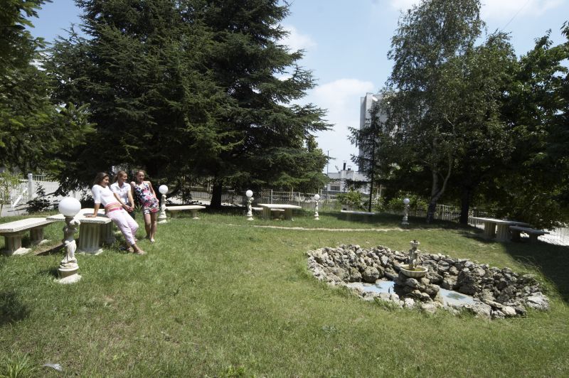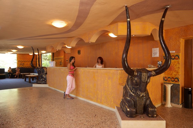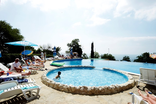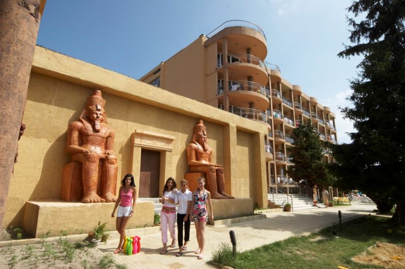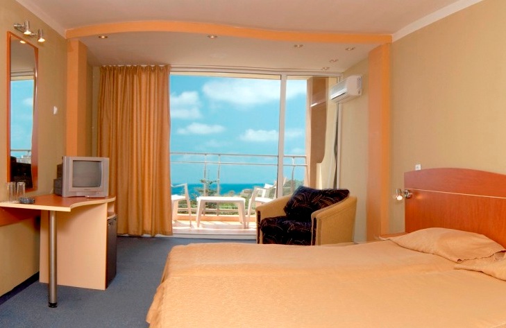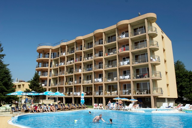 Расположен на высоком берегу моря в поселке Чайка в районе курорта Золотые Пески. В отеле 66 двухместных номеров