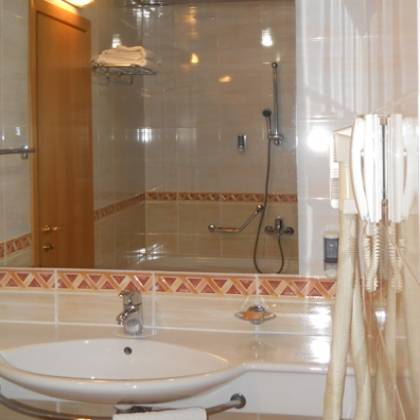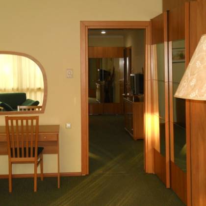 - В номерах: Все номера очень просторные, удобные, обставлены современной мебелью и бытовой техникой. Номера оснащены: кабельное ТВ, фен, мини- бар, телефон (внутренний), письменный стол, центральное отопление (регулируемоев комнате), кондиционер (регулируемыйв номере), совмещенный санузел с душем, джакузи, биде в ванной комнатев люксах номерах.