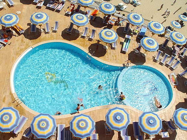 - Открытый бассейн, зонты и лежаки у бассейна;