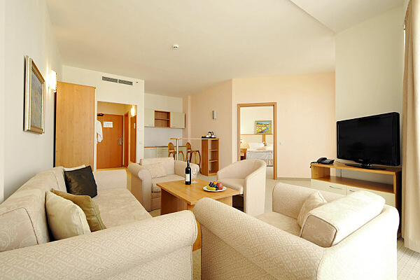 - Ap2pax (62 кв.м.) – спальня, гостиная (межкомнатная дверь), двуспальная кровать, доп. место - диван-кровать, кондиционер, спутниковое ТВ, телефон, радио, электрочайник, мини-бар ($), сейф, доступ в интернет ($), балкон, ванна, фен, косметический набор в ванной, гладильная доска, утюг, сушилка для белья, пол – ковролин