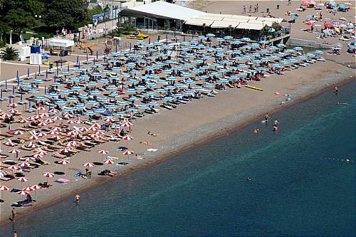 Песчано-мелкогалечный, в 100 метрах от отеля. Зонты и лежаки