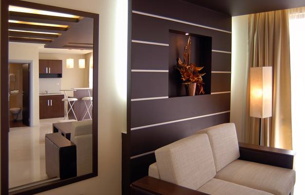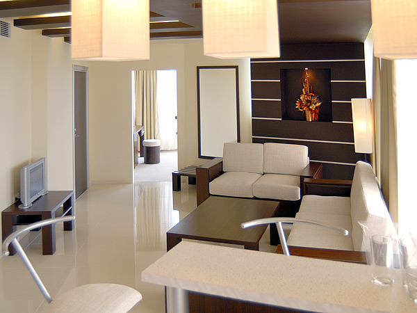 - Junior Suite (30 кв.м.) – двуспальная кровать/две отдельные кровати, кондиционер, TV SAT, телефон, мини-бар ($), сейф ($), доступ в интернет ($), балкон, душ, фен, косметический набор в ванной, сушилка для белья, пол – паркет, плитка.