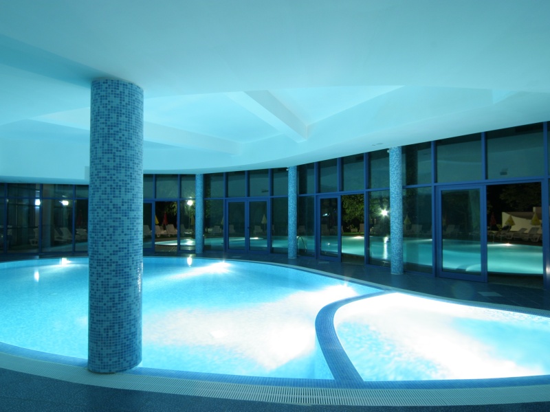 - Открытый бассейн, закрытый бассейн, зонты и лежаки у бассейна;