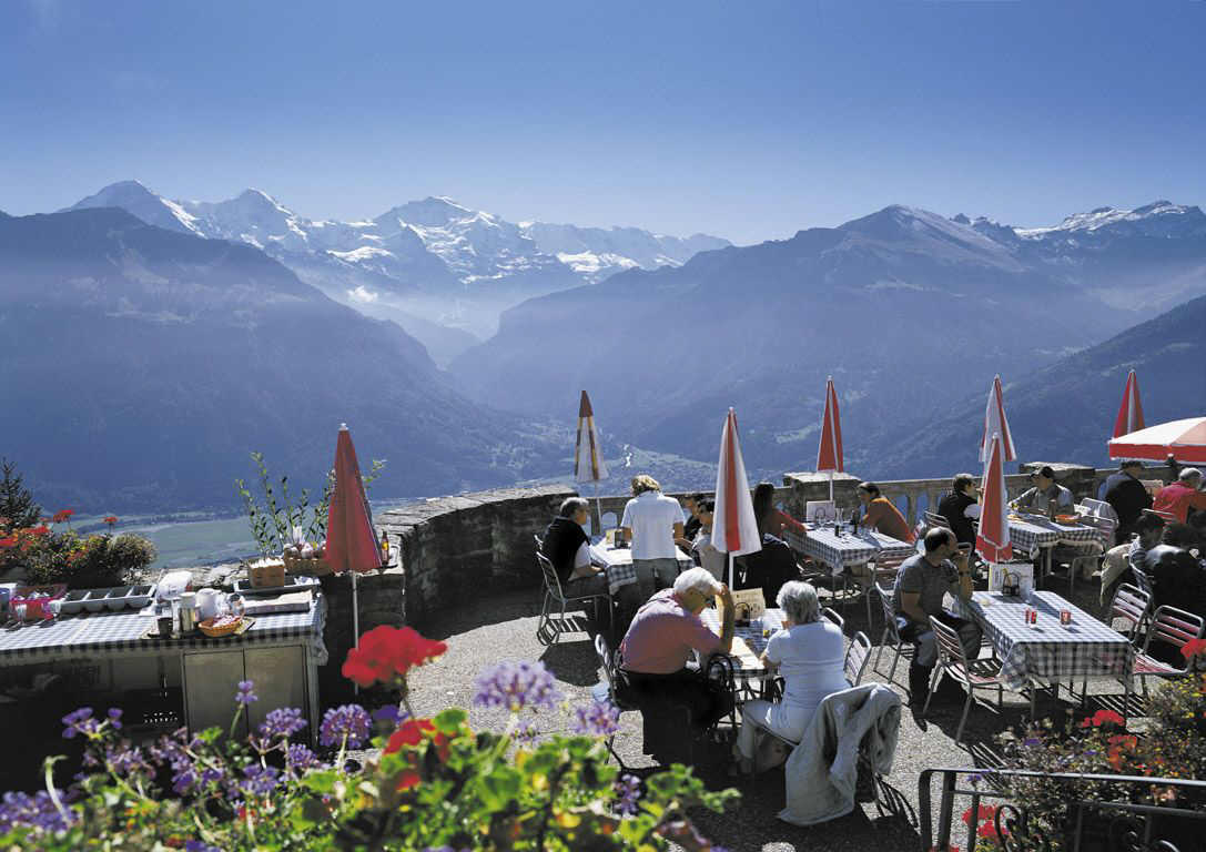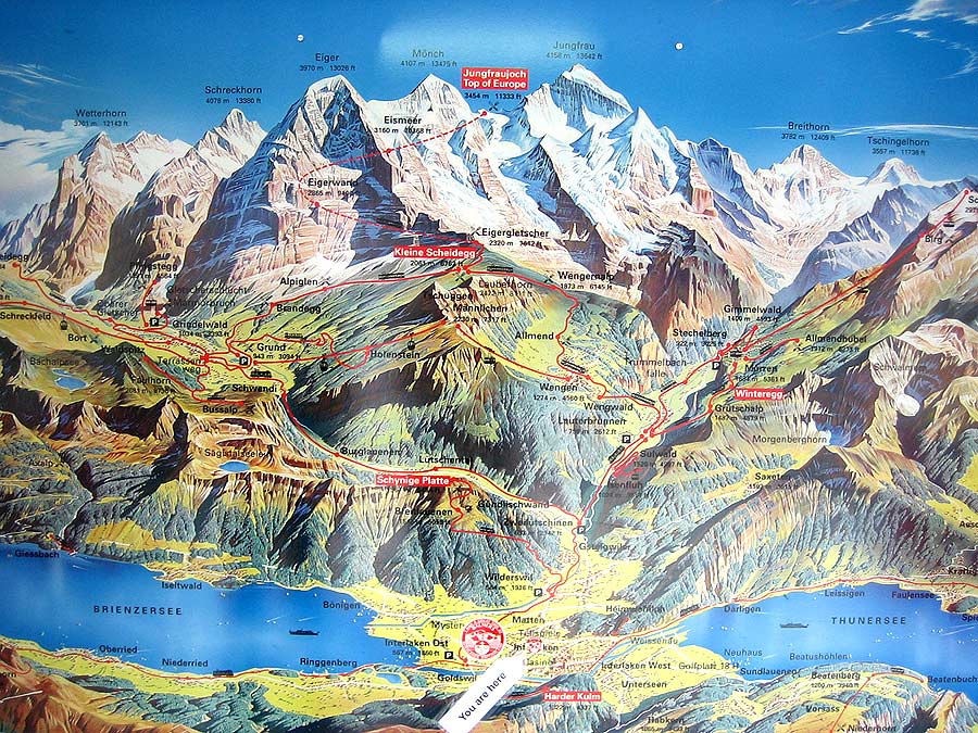 3. Harder Kulm - небольшая экскурсия до бельведера на высоте 1301 м, откуда открывается прекрасный вид на Альпы и два озера, Тун (Thun) и Бринц (Brienz). Добраться можно на фуникуллере от Interlaken East за 25 франков. Дорога займет около 15 минут. Отправление каждые пол часа с мая по октябрь, с 9 утра до 18 вечера. Наверху есть ресторанчик.