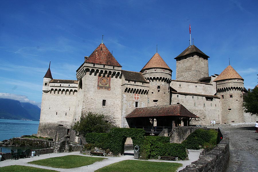 Жемчужиной Монтрё по праву считается знаменитый Шильонский замок (Chillon), воспетый Байроном в поэме "Шильонский узник". Он находится в 4 км, то есть около 40 минут ходьбы, от города. Лучше всего будет пройтись вдоль набережной, однако можно доехать на поезде. При входе в музей замка вам выдадут информационную брошюрку на предпочитаемом языке, и вы сможете самолично прогуляться по старинным залам (рыцарский зал, зал Правосудия, герцогская спальня), спуститься в подвал, служивший тюрьмой, или побродить по внутреннему дворику, сохранившим дух эпохи борьбы герцогов Савойских с протестантами. Замок строился и перестраивался в течении долгого времени. Самые ранние постройки относятся к 8 веку. С тех пор замок служил местом сбора дани благодаря своему расположению на стратегической дороге, зажатой между озером и горами. Облик замка не менялся с середины 13 века.