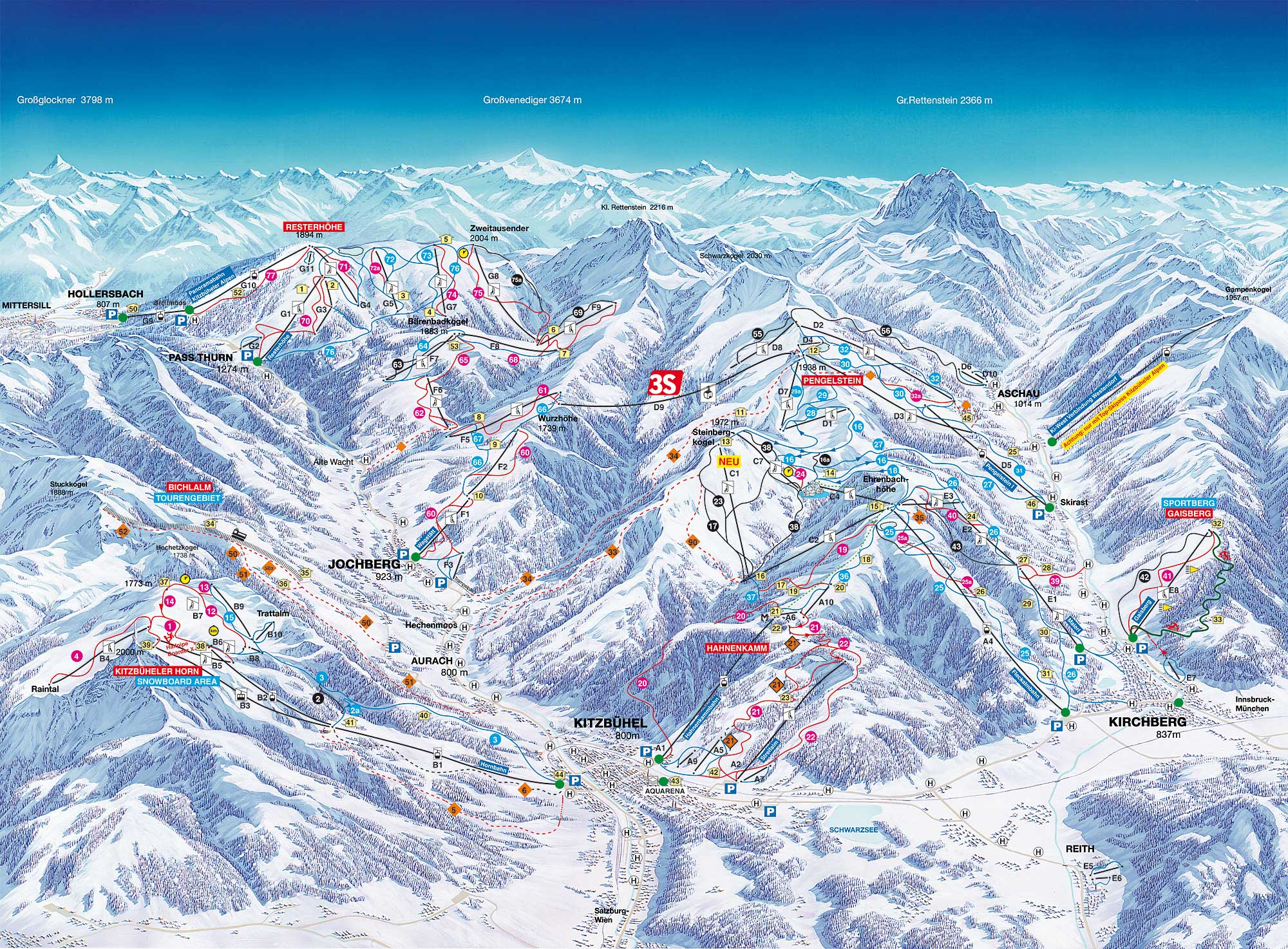 Горнолыжный курорт Китцбюэль – один из первых горнолыжных курортов Австрии, входит в известную во всем мире организацию “Best of the Alps”. Сам город и прилегающий к нему район заслужили право традиционно считаться колыбелью горных лыж Австрии. Именно здесь на зимнем курорте Китцбюэль почти 100 лет спустя возникла идея проведения соревнований на Кубок мира по горным лыжам. Для горнолыжников Китцбюэль – это прежде всего живописные горы, безукоризненно оборудованные спуски, высочайший сервис, комфорт и море развлечений. Спортивная слава, красота и элегантность курорта привлекают в горнолыжные туры в Китцбюэль богатых и знаменитых гостей. Регион катания соединяет поселки Китцбюэль, Кирхберг, Аурах, Йохберг, Пас – Турн, Аншау, Стукогель, Рестерхохе, Райт, расположенные на высоте 800 – 2000 м. Все поселки соеденены общей системой подъемников и автобусным сообщением, а между Китцбюэлем и Кирхбергом проложена железная дорога. Уникальная система склонов и подъемников позволяет кататься во время горнолыжного отдыха в Кинцбюэле практически на все известных трассах региона без использования ski-bus. Один из маршрутов начинается от поселка Клаузен, расположенного между Китцбюэлем и Кирхбергом, на подъемнике до района Пенгельштайн, далее спуск вниз в Йохберг, оттуда на вершину Вурцхохе (1973 м), а дальше цепочка спусков и подъемов в районе Рестерхехе. Второй - из Китцбюэля через Ханнекам, который охватит четыре основные зоны катания региона. Третий самый короткий, но более сложный, он начинается в Йохберге и заканчивается в Пас – Турне. Для начинающих самые удобные трассы в Кирхберге. Любители острых ощущений наверняка захотят испытать трассу Streif (длина 3,5 км, перепад высот 860 м, угол наклона 85%, скорость спуска 140 км/час) – самый сложный горнолыжный спуск в мире. Освещенная ночная трасса в Джохберг – Вагстайтлифт (18.30-21.30)