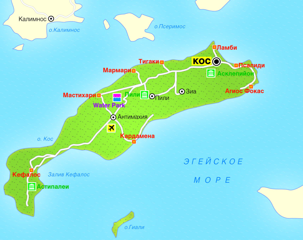 Столица острова - город Кос, располагается в северо-восточной части острова вокруг местного живописного порта.