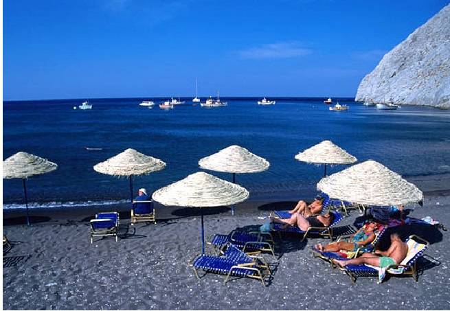 Достопримечательности Начав свой путь в центре Фира, отправляйтесь на один из самых значительных комплексов Греции - мыс Акротири. Здесь были обнаружены древние развалины, относящиеся к минойской эпохе после извержения вулкана Санторини в 1500 году до н.э. Поднявшись на вершину острова Санторини, вы попадете в монастырь Ильи Пророка. Здесь ежегодно проходит праздник-ярмарка, посетить которую можно 20 июня. Своим неповторимым стилем туристов привлекает деревушка Иа, расположенная в 11 км от Фиры. Только здесь можно насладиться традиционной красотой высеченных в скальной породе домиков (белых и голубых), особняками знати, выполненными в неоклассическом стиле, уютными мощеными плиткой улочками и двориками, а также прекрасным видом на море и закат. Среди прочих достопримечательностей Санторини выделяются: деревня Имеровигли, откуда можно полюбоваться красотой острова; средневековое поселение Пиргос. Можно покататься на подводной лодке «Атлатис», которая раскроет перед вами волшебный мир морского дна. Уникальные памятники культуры, элегантная архитектура и удивительные пейзажи - вот что привлекает многочисленных туристов на остров Санторини. Причем развитая инфраструктура делает такой отдых незабываемым. пляжи Санторини Благодаря тому, что остров тесно связан с историей потухшего вулкана, Санторини обладает неповторимым рельефом и пляжами самых разных оттенков: белого, черного и красного. В списке пляжей Санторини основное внимание 2-м местам : • Камари, который расположен чуть ниже Древней Тиры. Здесь вы найдете смесь черного вулканического песка и мелкой темной гальки. Т.к. туристов в данном районе великое множество, вдоль Камари протянулась полоса из небольших баров, таверн и отелей. • Перисса находится с противоположной стороны от горы Mesa Vouno. Здесь атмосфера располагает к тихому и спокойному отдыху в кругу семьи или близких людей. Вход в воду очень удобен, а скалы защищают 8-километровую береговую линию от ветра.