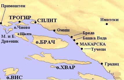 Городок Макарска (Makarska) с далматинской архитектурой уютно расположился в тихой бухте у подножья величественных гор и окружён полуостровами Осеява и Св. Петра. Макарска — тихое и спокойное местечко с чистыми галечными пляжами, от которого пошла целая Макарска Ривьера. Современные отели соседствуют здесь со старинным венецианским фонтаном и дворцами в стиле барокко. Мыс Св. Петра делит побережье Макарски на две бухты. В восточной, идущей от мыса Св. Петра до мыса Осеява, расположен порт и яхтенные причалы. Западная представляет собой курортную зону с пляжами, вдоль которой протянулась длинная прогулочная набережная Маринета, самое популярное среди туристов место в городе с замечательной сосновой аллеей и многочисленными кафе, ресторанами и клубами. Добраться до Макарска проще всего от аэропорта Сплит, который находится в 70 км. Трансфер могут предложить хозяева арендуемой виллы или менеджер гостиницы. Есть также возможность преодолеть это расстояние на такси, цена услуги стандартная, 100 евро, и редко колеблется в ту или другую сторону. Общественный транспорт для этих целей использовать неудобно, количество пересадок получается удручающим.